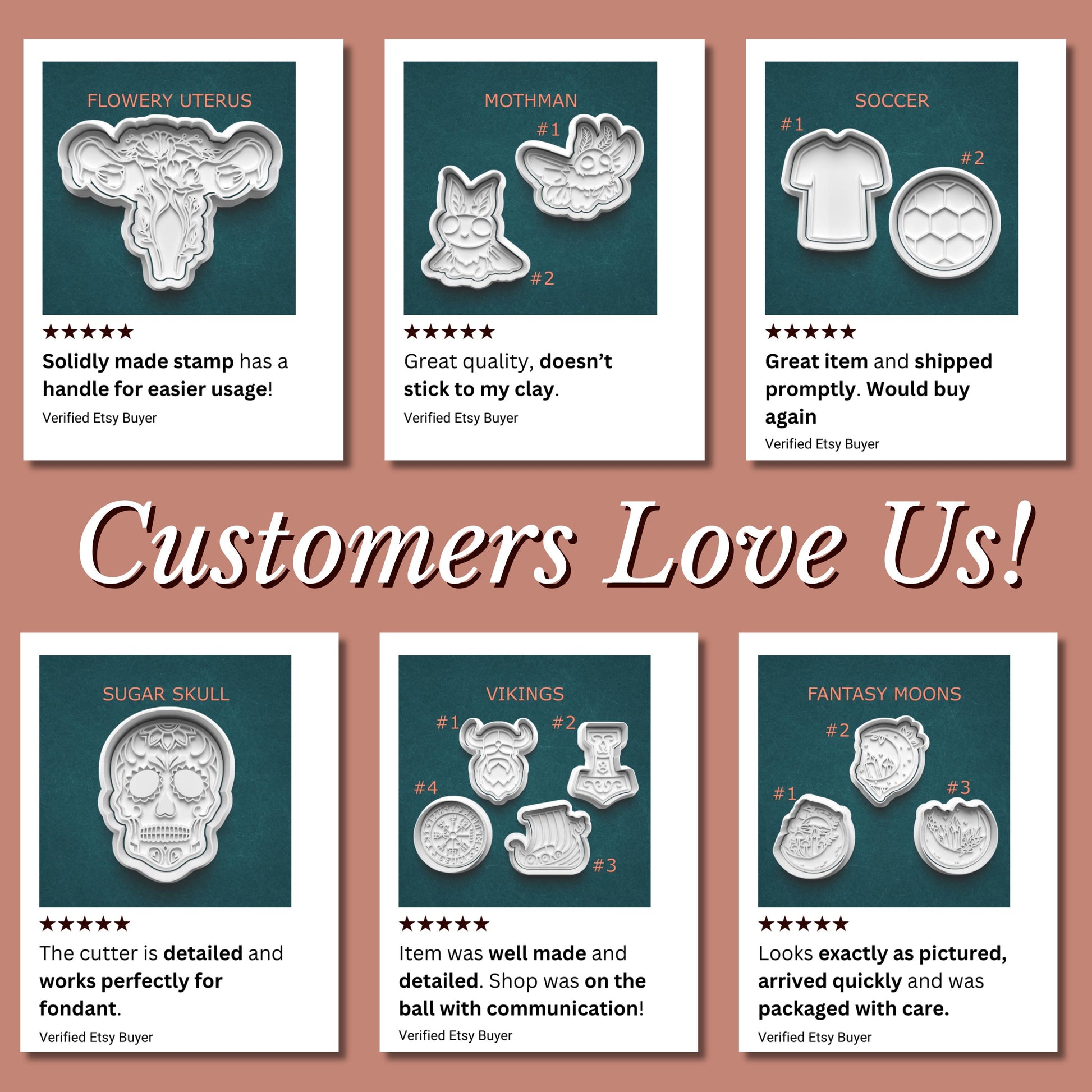 Custom 3D-Printed Cutter & Stamp Set – Perfect for Baking & Crafting! Create beautifully detailed cookies, fondant decorations, pet treats, and clay designs with our precision 3D-printed cutter and stamp sets! Each set includes two separate pieces—a cutter for clean edges and a stamp for adding intricate details.