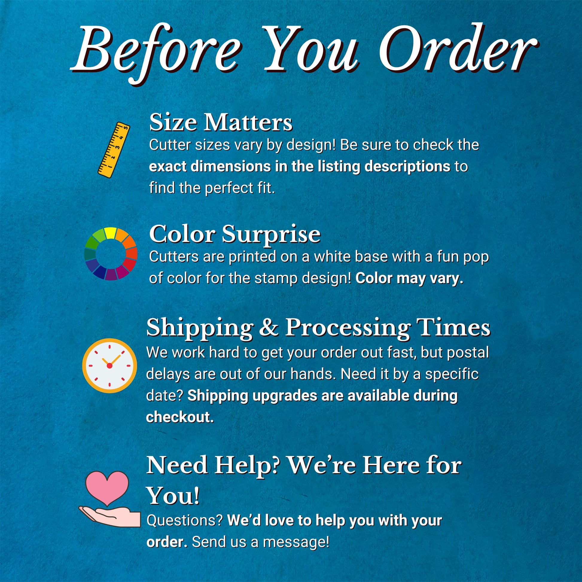 Our cutters are printed on a white base with a fun pop of color for the stamp! Colors may vary based on material availability, but rest assured, the function remains the same.