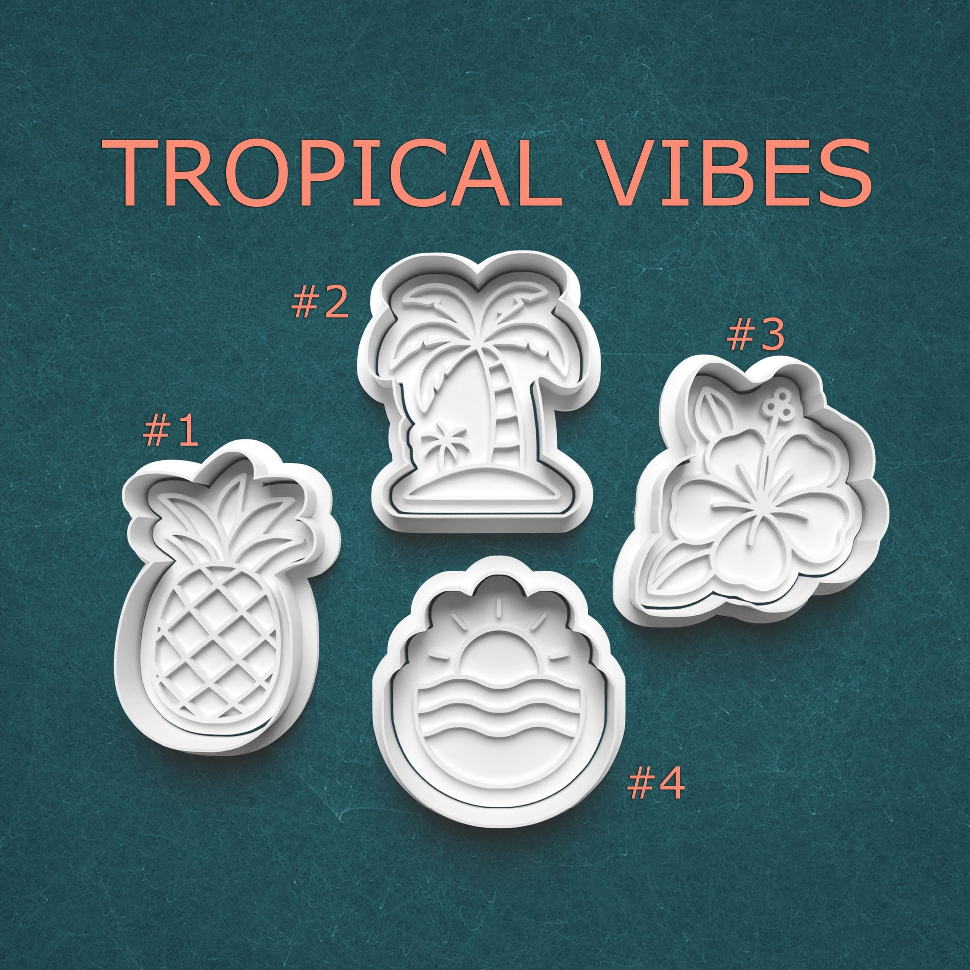 Tropical Vibes Cookie Cutter and Stamp Set ~ Pineapple ~ Palm Tree ~ Hibiscus ~ Sunset